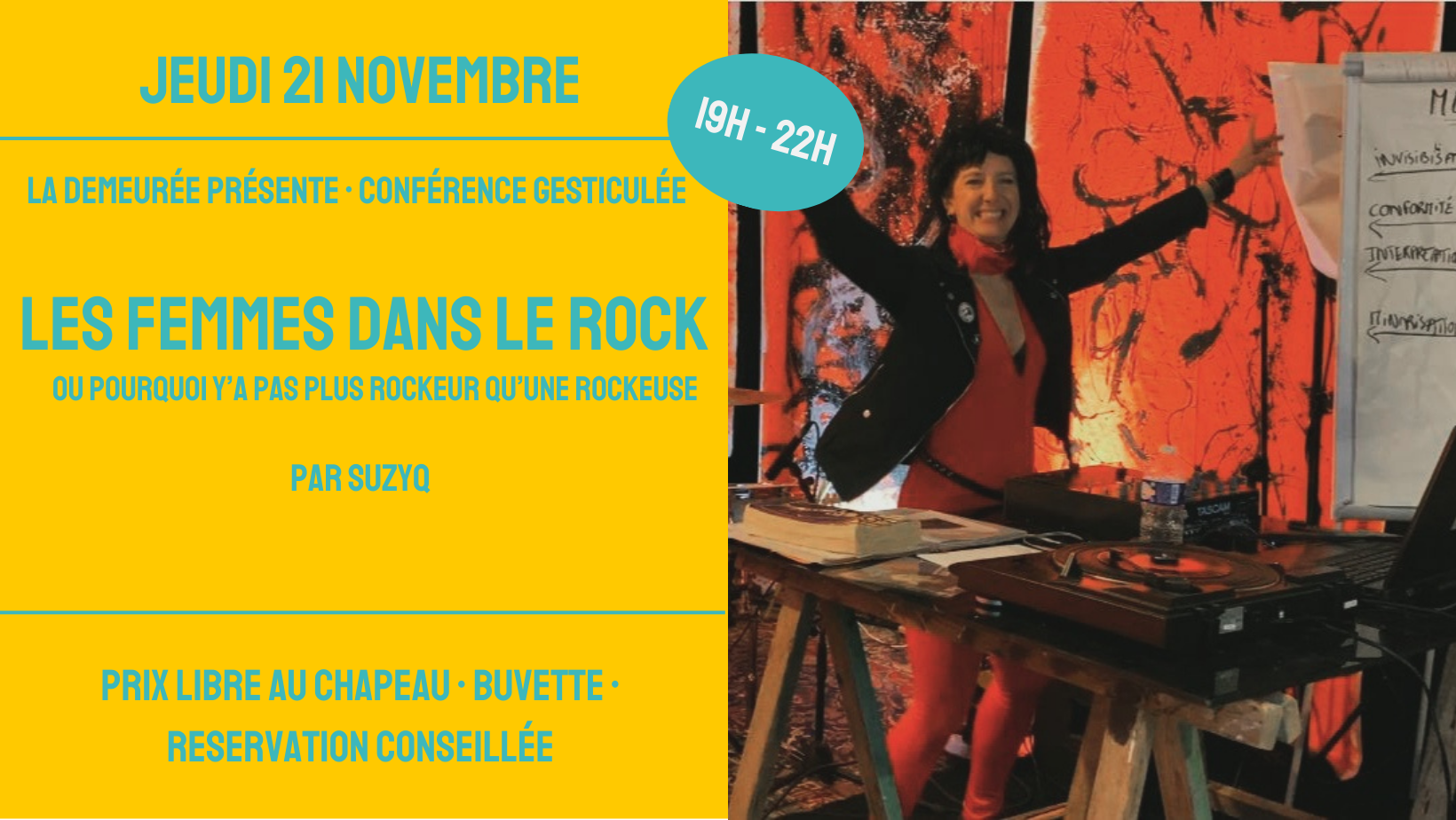 Suzanne Emery alias Suzy Q, partage ces questionnements dans sa conférence gesticulée intitulée "Les Femmes dans le Rock, ou pourquoi y'a pas plus rockeur qu'une rockeuse !"