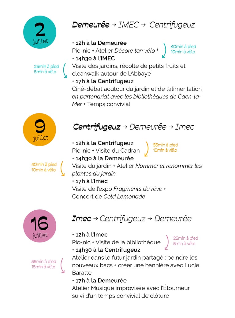 La Centrifugeuz (Chemin Vert), La Demeurée (Saint-Contest) et l’Imec (St-Germain-la-blanche-Herbe) proposent aux habitant.e.s une série d’événements et de rencontres accessibles à toutes et tous, autour des jardins et des pratiques partagées, les mercredis 2, 9 et 16 juillet de 12h à 18h30. En reliant les sites à pied ou en vélo, les participant.e.s partageront un repas, des ateliers et des visites, autant d’occasions de faire découvrir les lieux, les équipes et les possibles !