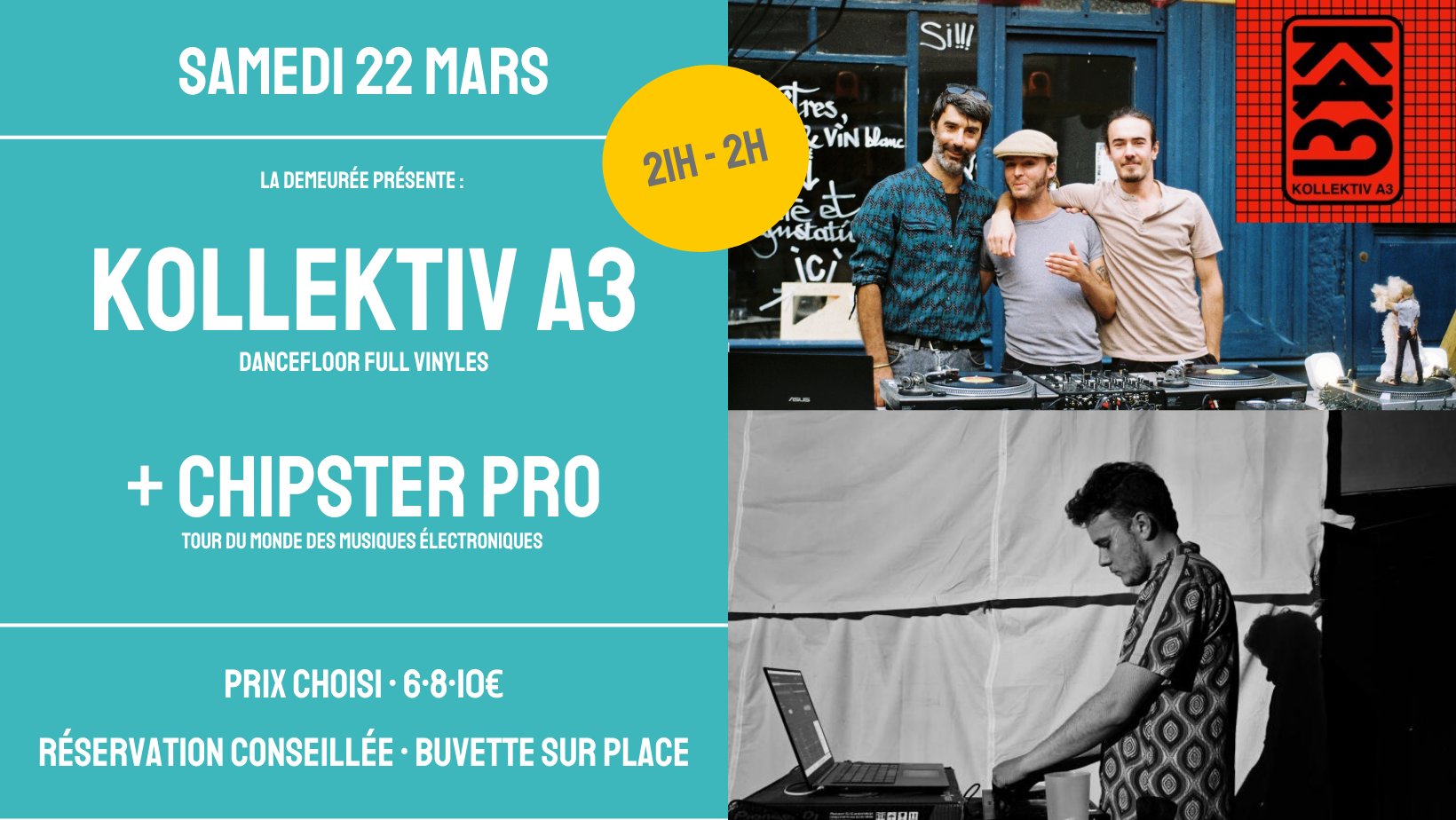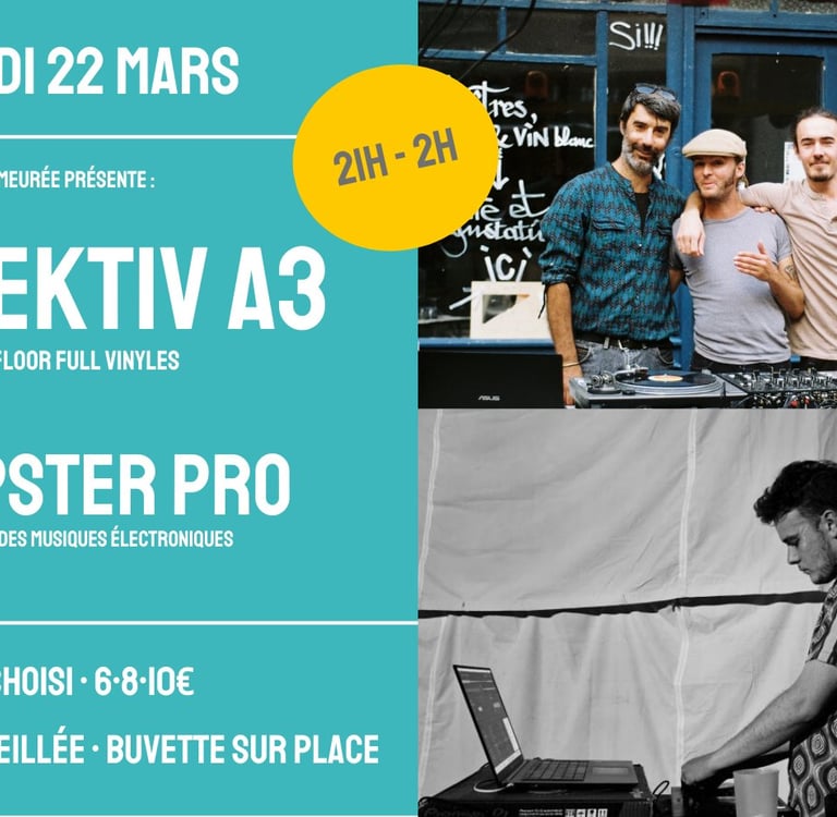 Le Kollektiv A3 est une association granvillaise composée de 3 amis passionnés de musique, désireux d'unir leurs influences et leurs savoir-faire pour créer un univers sonore et visuel à leur image. Ecléctiques, intergénérationnels, groovy et toujours en quête de découvertes musicales, leurs DJ-sets se veulent avant tout fédérateurs et dansants. Avec une sélection de vinyle sans limite (funk, afrobeat, disco, house, rock psychédélique, jazz, musique électronique, cumbia..), il y en aura pour tout le monde !