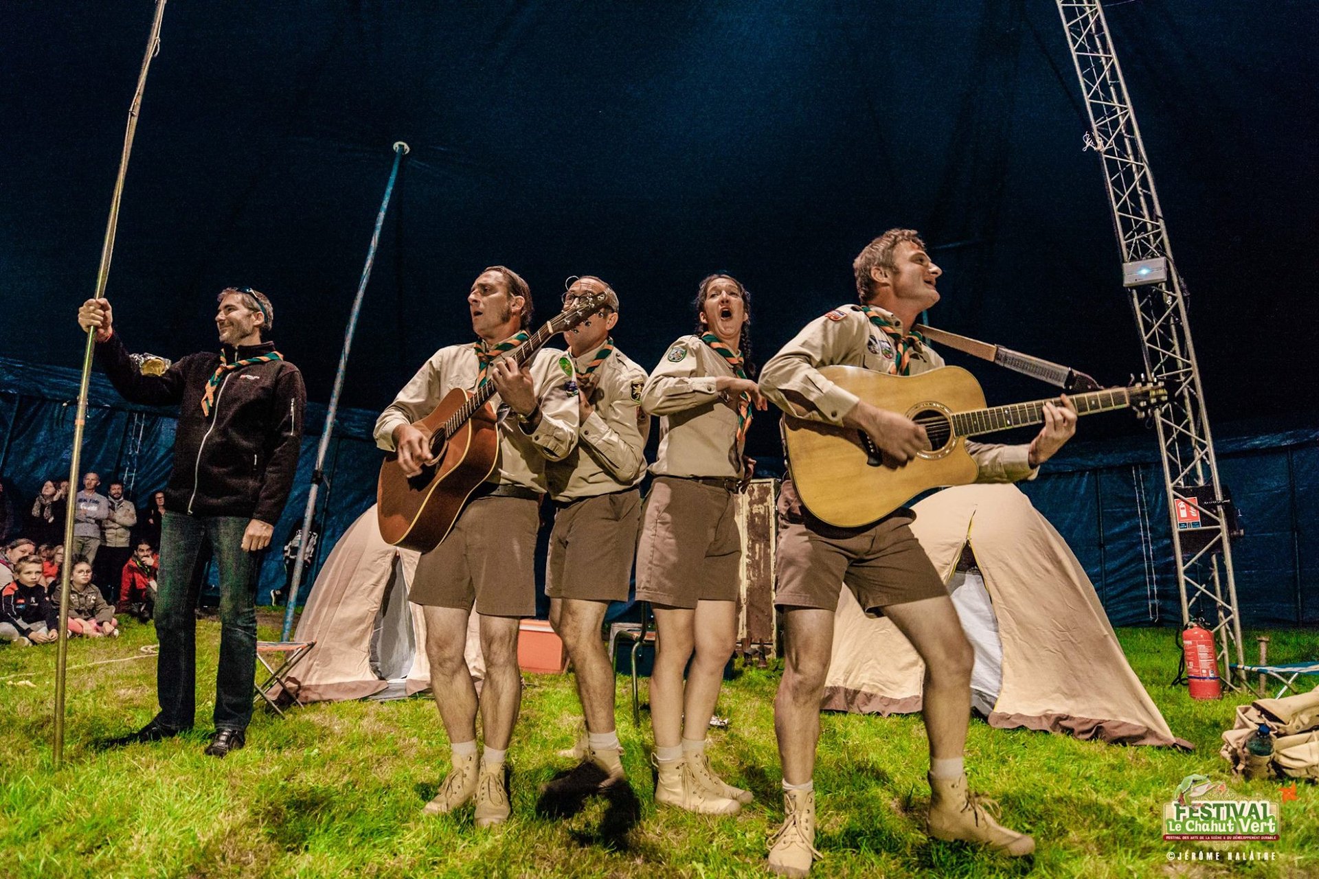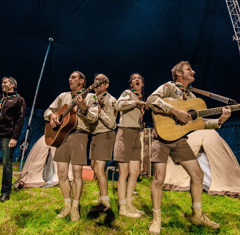 Et comment imaginer un scoutisme sans guitare ni chansons entraînantes ? Tout au long du spectacle, la musique occupe une place prépondérante, et le chant est une façon de poursuivre le récit et de raconter l’histoire qui est train de se jouer, à la manière d’une comédie musicale au pays de Baden Powell.