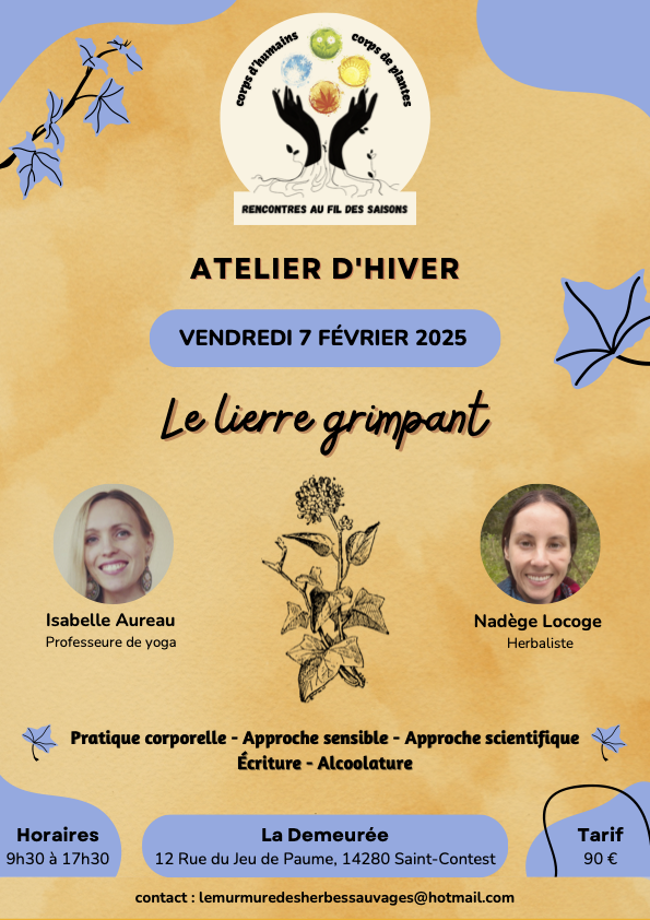 Pour l'atelier d'hiver du cycle "Corps humains, corps de plantes, rencontres au fil des saisons", Isabelle Aureau@isabelle.aureau et Nadège Locoge le murmure des herbes sauvages, vous proposent de partir à la rencontre d'une plante très commune dans notre flore : le lierre grimpant. Elles alterneront entre pratiques corporelles, écriture mais aussi botanique et réalisation d'une alcoolature.