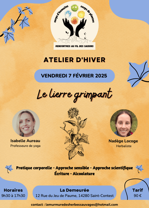 Pour vous inscrire ou pour tout renseignement vous pouvez aller sur ce lien https://www.billetweb.fr/corps-humains-corps-de-plantes-rencontres-au-fil-des-saisons ou envoyer un mail à lemurmuredesherbessauvages@hotmail.com
